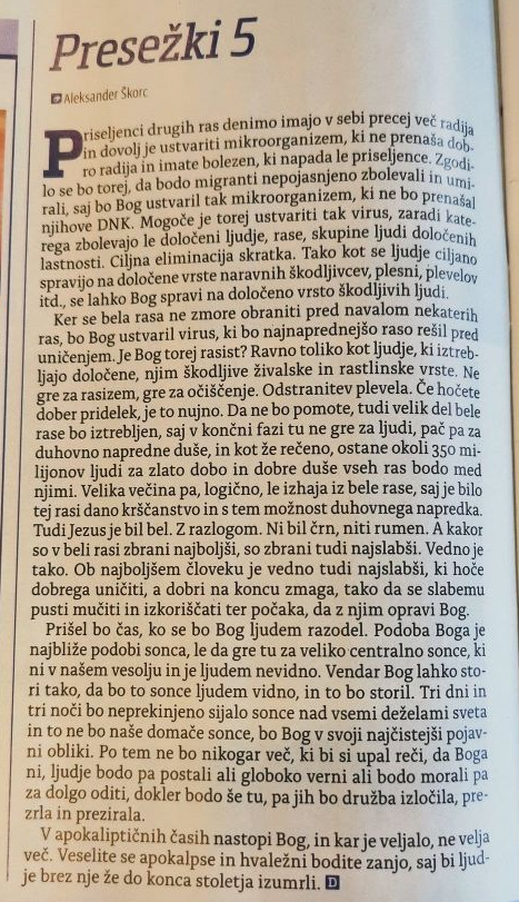 Ob prvem branju tega izredno kratkega prispevka se človek zgrozi in se vpraša ali morda živi v 40. letih prejšnjega stoletja ali v 20. letih našega stoletja? Po prvem šoku sem prav po šolsko odložil pero in ga zamenjal s svinčnikom ter začel podčrtovati besede, ki so me zbodle v oči. Priznam, kljub kratkemu zapisu, je na mojo grozo sivina kmalu zapolnila stran. Vsak, ki je kadarkoli poslušal kakšnega od mojih pogovorov ve, da sem močno nasproten ilegalnim migracijam, uničevanju Evropske kulture in civilizacije ter masovnemu preseljevanju narodov. Toda kljub vsem mojim konservativnim mislim in idejam, ne bi nikoli izjavil česa podobnega, niti v ponesrečeni neslani šali. To je bila ena mojih prvih misli; da je ta provokativen člančič le neslana šala. Ampak bolj, ko sem ga bral, bolj je moje upanje bledelo, zatorej čutim krščansko dolžnost, da opozorim na zmote, ki so omenjene v tej glosi.